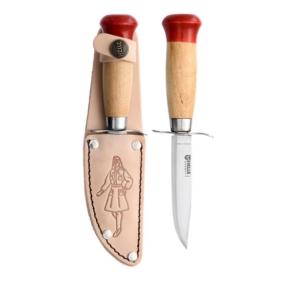 The Helle Speiderkniven is the standard Norwegian scout knife. The name is fitting as Speider means Scout in Norwegian. It has a simple drop point blade and a stamped double cross guard. This knife would be best suited to someone with a small hand. The genuine leather sheaths are stamped with the image of either a Girl Scout or a Boy Scout. Both styles now come with a light brown sheath. Please specify your preference in drop down box