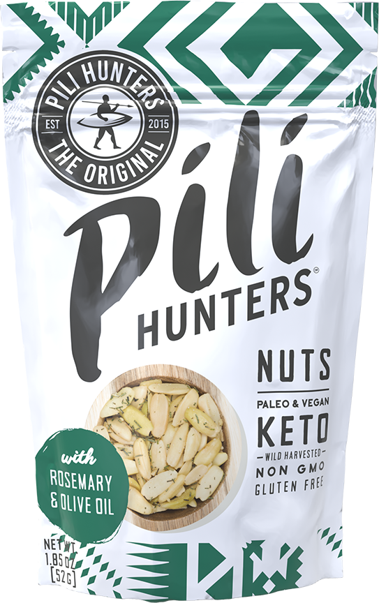 - Pili Hunters World Famous Sprouted Pili Nuts with a hint of Rosemary, extra virgin olive oil and a hint of salt.